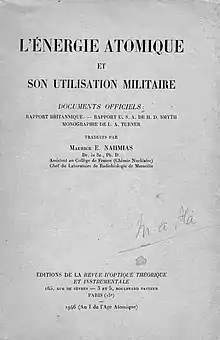 Première de couverture de l'ouvrage L'Énergie atomique et son utilisation militaire — traduction par Maurice Nahmias de plusieurs écrits dont le rapport Smyth — où la date 1946 précède la mention « An I de l'Âge atomique ».