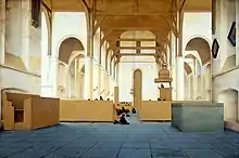 L'architecture, et celle des églises en particulier, fascine également les peintres de l'époque. Au début du siècle, le courant principal est la représentation de palais fantaisistes et des vues de villes à l'architecture maniériste et inventée. Par la suite, un plus grand réalisme commence à apparaître, et les intérieurs et les extérieurs de bâtiments réels sont reproduits, bien que pas toujours fidèlement. La compréhension du rendu approprié de la perspective se développe et la méthode est alors appliquée avec enthousiasme. Quelques artistes se spécialisent dans les intérieurs d'églises, notamment Pieter Jansz Saenredam, dont le père gravait de sensuelles déesses à la façon maniériste, qui peint des vues d'églises gothiques désertes et blanchies à la chaux. Saenredam met l'accent sur la lumière et la géométrie, avec peu de représentation des textures de surfaces, et son style s'oppose à celui d'Emanuel de Witte qui dépeint les fidèles, les planchers inégaux, les contrastes de lumière et le mobilier des temples calvinistes. De Witte, influencé par la peinture de Gerard Houckgeest, complète la vue traditionnelle le long de l'axe principal de l'église par des vues diagonales qui ajoutent de l'intérêt[44]. Gerrit Berckheyde se spécialise quant à lui dans les vues de rues principales, places et édifices publics principaux des villes, alors que Jan van der Heyden préfère dépeindre des scènes plus intimes de rues paisibles d'Amsterdam, avec souvent des arbres et des canaux, vues réelles qu'il n'hésite pas à modifier pour un effet de composition[45].
