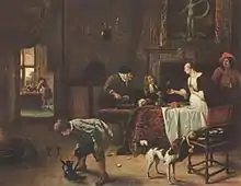 Cette génération postérieure, dont le travail paraît maintenant trop raffiné comparé à celui de leurs prédécesseurs, réalise également des portraits et des peintures d'histoire et compte parmi elle les peintres les plus considérés et récompensés de la fin du siècle, leurs œuvres étant recherchées dans toute l'Europe[37]. La peinture de genre reflète la prospérité croissante de la société néerlandaise, et les toiles représentent de plus en plus le confort et l'opulence comme le siècle avance. En dehors de l'École de Leyde, d'autres artistes peignent des scènes de genre dans un style plus intime, notamment Nicolas Maes, Gerard ter Borch et Pieter de Hooch, dont l'intérêt pour la lumière dans les scènes d'intérieur est partagé par Johannes Vermeer, un personnage longtemps anonyme qui est désormais reconnu comme le plus grand peintre de genre du siècle.