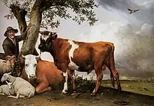 Les paysages incluant des animaux au premier plan constituent un sous-genre bien distinct qui est notamment représenté par Paulus Potter, Albert Cuyp, Karel Dujardin et Philips Wouwerman, ce dernier étant spécialisé dans la peinture de chevaux et de cavaliers. La vache, symbole de prospérité pour les Néerlandais, est, en dehors du cheval, de loin l'animal le plus représenté dans la peinture de l'âge d'or, alors que les chèvres sont représentées dans les paysages à l'italienne. Le Taureau, de Paulus Potter est une toile célèbre et monumentale, emmenée à Paris par Napoléon avant d'être restituée plus tard, dont le spécimen représenté au premier plan a été analysé par des spécialistes des bovins qui ont conclu, d'après les différentes parties de son anatomie, qu'il était le résultat de six animaux différents d'âges très variés[43].