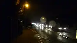 - en diffusant la lumière dans des particules en suspension dans l'air (par exemple, lorsque les phares d'une voiture illuminent le brouillard proche du véhicule, empêchant de voir à une plus grande distance).