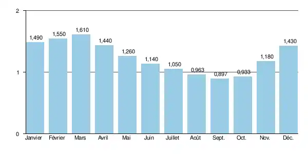 Le débit journalier maximal a été observé le pour 15,0 m3/s. Le débit instantané maximal a été observé le même [note 2] avec 20,8 m3/s en même temps que la hauteur maximale instantanée de 162 cm soit 1,62 m[2].