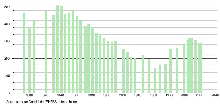 L'évolution du nombre d'habitants est connue à travers les recensements de la population effectués dans la commune depuis 1793. Pour les communes de moins de 10 000 habitants, une enquête de recensement portant sur toute la population est réalisée tous les cinq ans, les populations légales des années intermédiaires étant quant à elles estimées par interpolation ou extrapolation[24]. Pour la commune, le premier recensement exhaustif entrant dans le cadre du nouveau dispositif a été réalisé en 2004[25].