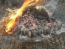 On recouvre ensuite d'une bonne épaisseur d'aiguilles de pin, auxquelles on met le feu, qu'on active à l'aide d'un carton, qui sera également utilisé pour disperser les cendres à la fin de la cuisson. L'opération peut être renouvelée jusqu'à cuisson satisfaisante des moules, c'est-à-dire jusqu'à ce que les moules s'entrouvrent légèrement. Traditionnellement on ne se cantonnait pas aux aiguilles de pin, le combustible pouvant être des ripes de bois fines[5], ou des fanes de fèves, ces dernières étant même préférées par les locaux[5],[3] parce qu'elles brûlent juste le temps nécessaire[5].
