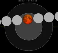 L'éclipse était visible après le coucher de soleil du sur la plus grande partie de l'Amérique du Nord et toute l'Amérique du Sud, en Europe et en Afrique au milieu de la nuit, et au Proche et Moyen-Orient un peu avant le lever du soleil le 1er mars.
