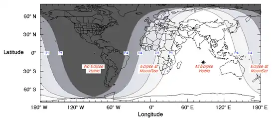 L'éclipse fut visible de la totalité de l'océan Indien, et de la grande partie de l'Afrique, l'Asie et l'Océanie.