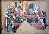 Le nom de Lello da Orvieto est un cas très discuté de l'art napolitain du XIVe siècle : comme l'hypothèse a été émise dans des études de la fin du XXe siècle, le peintre serait arrivé dans la ville peut-être en 1314, et serait originaire d'Urbevetere (Orvieto) ou de Rome[15]. Il semble être un peintre de culture romaine et Cavallinesque. La peinture murale avec l' Arbre de Jessé dans la chapelle des Illustrissimi, anciennement de San Paolo, dans la cathédrale Notre-Dame-de-l'Assomption, lui a été attribuée comme son premier travail réalisé dans la ville ; on a émis l'hypothèse d'une commande de l'archevêque Umberto d'Ormont, qui a lieu entre 1314 (fin des travaux d'agrandissement de l'église) et 1320 (date du décès du prélat). La mosaïque de la Madone entre les Saints Gennaro et Restituta dans la basilique Santa Restituta, signée et datée 1322 (plus récemment lu 1313) [16], montre également une culture romaine claire dans la composition avec seulement trois personnages, dans le savante construction en perspective, dont le trône de construction spatiale solide, même si la mosaïque romaine révèle une préciosité plus accentuée. Une autre fresque, qui lui est attribuée dans l'ancien réfectoire du couvent de la basilique Santa Chiara de Naples, datant d'environ 1340, montre une prise de conscience des nouveautés de l'art de Giotto apparues entre-temps dans la ville[17]. La figure de Lello, bien que de physionomie incertaine, montre la pénétration et la persistance de la culture artistique de la ville de Naples.