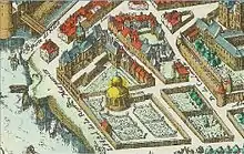 L'hôtel de la reine Marguerite sur le plan Merian (1615-1619) : on y distingue la chapelle octogonale (en jaune).