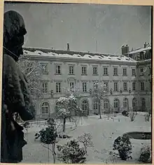 À l'occasion de l'instauration d'écoles normales primaires en 1845, l'École normale est rebaptisée École normale supérieure. C'est le que l'École normale supérieure s'installe dans ses nouveaux locaux au 45 rue d'Ulm, « sur le site quasi-campagnard de l'ancienne vigne du couvent des Ursulines[16] », dans le 5e arrondissement de Paris, comme cela avait été décidé par la loi du [17]. La cour Pasteur correspond à la partie nord du parc du couvent des Feuillantines, où jouait Victor Hugo enfant. L'ENS occupe encore ces locaux de la rue d'Ulm, agrandis notamment par la construction en 1937 de bâtiments rue Lhomond pour les sciences expérimentales.