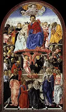 Le Maître de l'Observance, peut-être à confondre avec Sano di Pietro au début de sa carrière et fortement influencé par Sassetta[16], tire son nom d'une Vierge à l'Enfant et des saints Ambrogio et Gerolamo pour la basilique de l'Observance. La première œuvre connue de Sano di Pietro est le polyptyque des Gesuati à la Pinacothèque nationale, daté de 1444, où il reprend des caractéristiques stylistiques et des compositions déjà consolidées. Sa veine narrative s'exprime dans la prédelle et dans les scènes de relatives à l'actualité de la ville (Sermon de San Bernardino sur la Piazza del Campo et Sermon de San Bernardino sur la Piazza San Francesco).