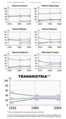 - 4 villages avec environ 50% de Moldaves avec uniquement des écoles de langue russe : Zozuliani (district de Rîbnița), Crasnoie, Glinoia (district de Slobozia), Protiagailovca (près de Tighina).