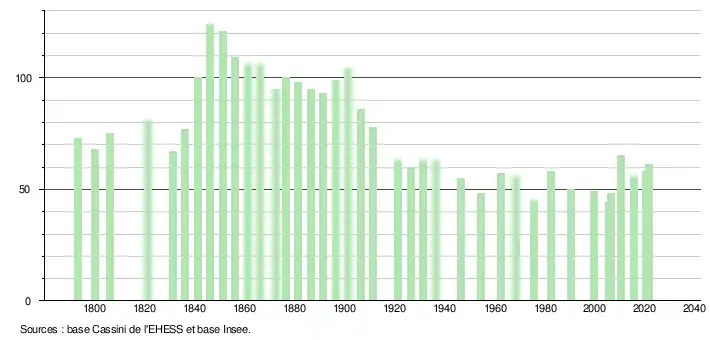 L'évolution du nombre d'habitants est connue à travers les recensements de la population effectués dans la commune depuis 1793. Pour les communes de moins de 10 000 habitants, une enquête de recensement portant sur toute la population est réalisée tous les cinq ans, les populations légales des années intermédiaires étant quant à elles estimées par interpolation ou extrapolation[23]. Pour la commune, le premier recensement exhaustif entrant dans le cadre du nouveau dispositif a été réalisé en 2005[24].