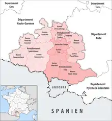 Petit département par sa population cependant en légère croissance depuis 1982, avec 153 954 habitants, l'Ariège se classe devant les cinq départements les moins peuplés en 2020, à savoir la Lozère (76 633 habitants), la Creuse (115 995 habitants), le Territoire de Belfort (140 120 habitants), les Hautes-Alpes (140 605 habitants) et le Cantal (144 379 habitants)[2]. Cette stabilité globale est à remarquer alors que nombre de départements connaissent un déclin important. Celle-ci s'explique notamment par l'héliotropisme, un immobilier accessible et un environnement privilégié qui attirent des télétravailleurs[3],[4], des artistes, des jeunes retraités... rassurés par la facilité d'accès à la métropole toulousaine.