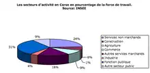 L'économie de la Corse a été longtemps dominée par l'agriculture et l'élevage mais maintenant, elle se compose surtout de commerces et d'industrie touristique (hôtels, loisirs). Après la crise des années 1990, la Corse se porte clairement mieux et est en progression sur tous les plans mais sa situation reste néanmoins fragile. En 2003, son PIB par habitant était toujours inférieur de 11,5 % à la moyenne des régions françaises[2]. La Corse a une économie très typée : peu d'industrie, une agriculture faible et un poids important du tourisme, de l'administration et de la construction.