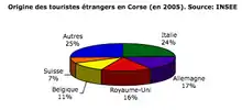 Les touristes visitant la Corse sont en grande majorité français. En 2007, 2,062 millions de touristes français se sont rendus en Corse, soit 72,5 % du nombre total de touristes[6].