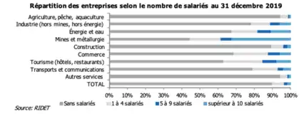Seulement 2 % des entreprises ont plus de dix salariés, principalement dans les secteurs du nickel, du tourisme et de la production énergétique[8].