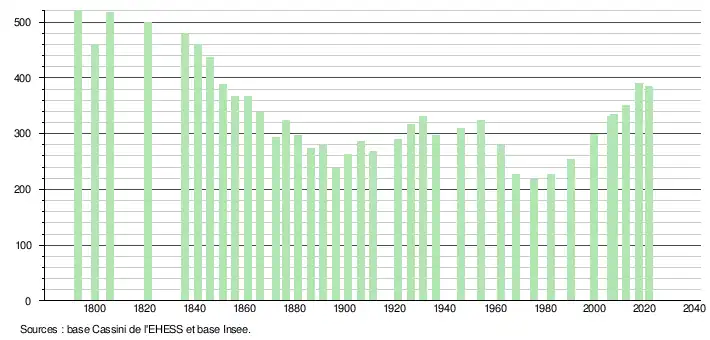 L'évolution du nombre d'habitants est connue à travers les recensements de la population effectués dans la commune depuis 1793. Pour les communes de moins de 10 000 habitants, une enquête de recensement portant sur toute la population est réalisée tous les cinq ans, les populations légales des années intermédiaires étant quant à elles estimées par interpolation ou extrapolation[22]. Pour la commune, le premier recensement exhaustif entrant dans le cadre du nouveau dispositif a été réalisé en 2007[23].