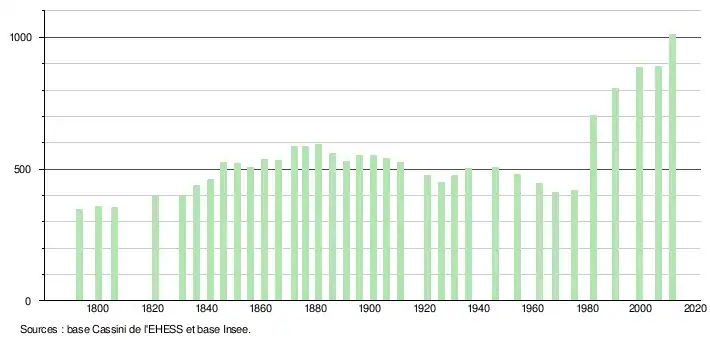 L'évolution du nombre d'habitants est connue à travers les recensements de la population effectués dans la commune depuis 1793. À partir du , les populations légales des communes sont publiées annuellement dans le cadre d'un recensement qui repose désormais sur une collecte d'information annuelle, concernant successivement tous les territoires communaux au cours d'une période de cinq ans. Pour les communes de moins de 10 000 habitants, une enquête de recensement portant sur toute la population est réalisée tous les cinq ans, les populations légales des années intermédiaires étant quant à elles estimées par interpolation ou extrapolation[6]. Pour la commune, le premier recensement exhaustif entrant dans le cadre du nouveau dispositif a été réalisé en 2006[7],[Note 1].