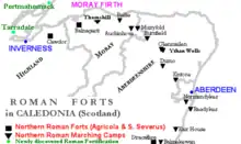 - « Aucun des sites supposés découverts ces dernières années par une recherche aérienne dans le Moray et le Nairn n'a les caractéristiques morpholiques qui distinguent les forts romains », Hanson, 2003, p. 198.