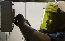 Un écran facial balistique est une partie d'une armure conçue pour stopper ou dévier une explosion ou des projectiles[5],[6].