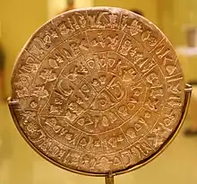 - des hiéroglyphes gravés sur des sceaux en stéatite ou dans de l'argile, tel le disque de Phaistos datant de la première moitié du IIe millénaire av. J.-C. ;