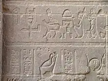 Le plus souvent, les hiéroglyphes se lisent de droite à gauche. Le sens de la lecture est indiqué par l'orientation des têtes humaines ou des oiseaux, le lecteur devant lire en allant vers la face ou le bec, sauf si l'inscription est placée à côté de la statue d'un dieu important[36].