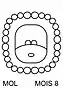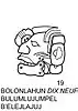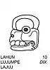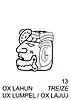 Les chiffres : les Mayas comptent couramment en base 5, bien que les prêtres comme on l'a vu ci-dessus comptaient aussi en base 20 pour les calendriers. Chaque chiffre ou nombre, et ce, au moins jusqu'à 20 possède un caractère sacré. Il est associé à un dieu tutélaire. Il a donc deux représentations. La première dans la 1re ligne ci-dessous à l'usage du comptage courant et compréhensible par tous. La seconde ligne, à l'usage des prêtres, est le visage du dieu associé. Le dernier glyphe de la série ci-dessous CHUM (également 20) est d'usage exclusif pour exprimer le dernier jour de chaque mois du calendrier haab. Il est généralement placé sous le sigle du mois qui va suivre, d'où son nom de piédestal. En écriture maya finalement on n'écrit pas 20 Pop, mais « CHUM » sous le glyphe du mois UO qui suit. On pourrait en conséquence plutôt considérer ce glyphe comme une analogie de zéro[24].