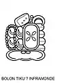 Les dieux : Au premier des neuf niveaux (Bolon Tiku) de l'Inframonde (Xibalba) : se trouve AKBAL KIN, le soleil dans sa pérégrination souterraine du coucher au lever. À gauche est représenté le cycle des croyances maya à son sujet. À lire dans le sens des aiguilles d'une montre. Au coucher le soleil est déstructuré et son essence (le sang) est aspirée par le tunnel nocturne qu'il va parcourir toute la nuit. Le dieu lui-même terrorisé par cette transformation est représenté en roi au-dessus de son glyphe criant et implorant. Il porte les attributs royaux, le collier, mais aussi celui du sacrifié : le nœud de tissu dans les cheveux et l'aiguillon de raie pour la saignée. Son glyphe est représenté en bijou sur son oreille. À la fin de la nuit il renait petit et grandit jusqu'à redevenir le glyphe du jour suivant. On devine 3 embryons de soleil en train de croître. De ce point de vue, le soleil n'est pas un dieu omnipotent, il est soumis au pouvoir de la main divine qui le pousse vers la nuit (Probablement Yum Cimil, le dieu de tous les enfers). Le moment du coucher du soleil est vécu par les Mayas anciens comme l'épreuve du sacrifice du soleil au monde des ténèbres[25]. Sur les 3 premières lignes on trouve les autres dieux des enfers "les Bolon Tiku" dont au moins quatre présentent un chiffre en préfixe de glyphe, Le poing au-dessus de la tête se lit "2", quatre glyphes plus loin on lit le chiffre "5" puis "7" puis "9" et de nouveau "9". Suivent les dieux du ciel, Ixchel (déesse de la lune) et l'un de ses quatre avatars Ix Chebel Yax (La lune croissante patronne des paysans), Itzamna (dieu soleil et époux d'Ixchel), Ek Chuah (dieu des marchands), Buluk Ch'aptan (Dieu de la guerre) peut être un autre nom du dieu précédent tant les glyphes semblent similaires. En dernier l'un des plus importants et de ceux qui réclamaient le plus de sacrifices : Chac, le dieu de la pluie.