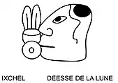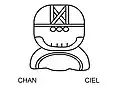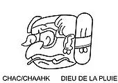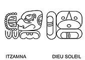 Les astres : ce sont aussi pour la plupart des dieux qui ont pu à différentes époques être assimilés à des rois ou reines qui leur ont laissé provisoirement d'autres noms, comme pour la période 900-1200 après J.-C. au Yucatan, Itzamna est le dieu soleil et son épouse Ixchel la déesse lune, tous deux vraisemblablement fondateurs de la cité de Chichen Itza. Les glyphes ci-dessous sont ceux de l'élément non déifié[24].