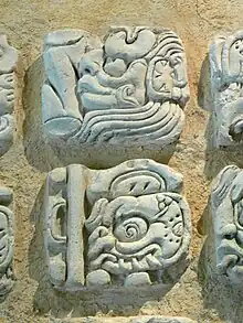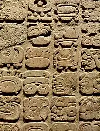 L'élément de base de l'écriture maya est un signe que l'on appelle « glyphe ». Ces glyphes sont groupés de façon à former des « blocs » d'aspect plus ou moins carré. À l'intérieur du bloc glyphique, les épigraphistes distinguent plusieurs types de glyphes: pour désigner le glyphe le plus grand, ils parlent de « signe principal », pour les plus petits d'« affixes ». Dans le sens des aiguilles d'une montre, on parle de « préfixes » (à gauche du signe principal), de « superfixes » (au-dessus), de « postfixes » (à droite) et de « subfixes » (en dessous). Tous ces éléments ne sont pas nécessairement présents dans un bloc glyphique, qui peut par exemple ne comporter qu'un signe principal. On a jusqu'à présent identifié plus de 800 glyphes différents. Le mayaniste Eric Thompson a été le premier à en établir un catalogue[18]. Chaque signe est désigné conventionnellement par la lettre T suivie d'un nombre.
