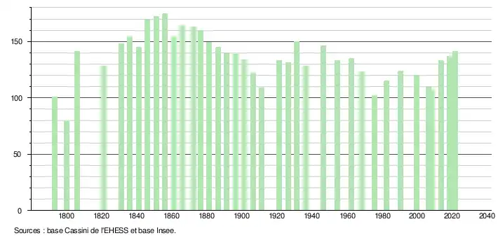L'évolution du nombre d'habitants est connue à travers les recensements de la population effectués dans la commune depuis 1793. Pour les communes de moins de 10 000 habitants, une enquête de recensement portant sur toute la population est réalisée tous les cinq ans, les populations légales des années intermédiaires étant quant à elles estimées par interpolation ou extrapolation[18]. Pour la commune, le premier recensement exhaustif entrant dans le cadre du nouveau dispositif a été réalisé en 2008[19].