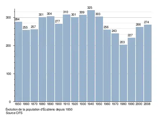 Le graphique suivant résume l'évolution de la population d'Écublens entre 1850 et 2008[5] :