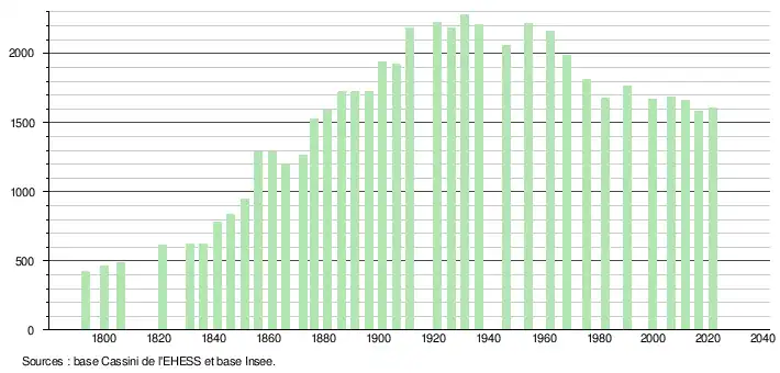 L'évolution du nombre d'habitants est connue à travers les recensements de la population effectués dans la commune depuis 1793. Pour les communes de moins de 10 000 habitants, une enquête de recensement portant sur toute la population est réalisée tous les cinq ans, les populations légales des années intermédiaires étant quant à elles estimées par interpolation ou extrapolation[17]. Pour la commune, le premier recensement exhaustif entrant dans le cadre du nouveau dispositif a été réalisé en 2006[18].