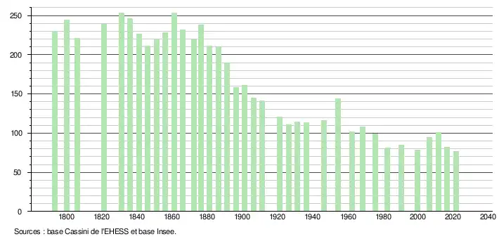 L'évolution du nombre d'habitants est connue à travers les recensements de la population effectués dans la commune depuis 1793. Pour les communes de moins de 10 000 habitants, une enquête de recensement portant sur toute la population est réalisée tous les cinq ans, les populations légales des années intermédiaires étant quant à elles estimées par interpolation ou extrapolation[13]. Pour la commune, le premier recensement exhaustif entrant dans le cadre du nouveau dispositif a été réalisé en 2006[14].