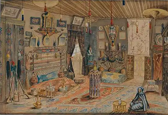 - Il reconstitue un fumoir arabe éclairé par une fenêtre mauresque, qu'il meuble de coffres, d'aiguières et de lanternes, ainsi qu'un harem avec divan, lustre, service à café et narguilé.