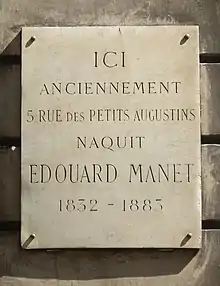 Plaque au no 5 rue Bonaparte (ancienne rue des Petits-Augustins).