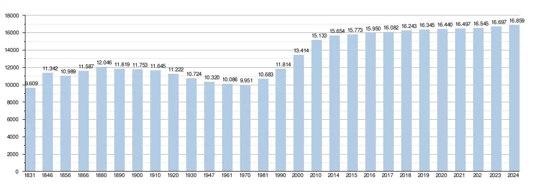 Elle comptait, au , 16 845 habitants (8 298 hommes et 8 547 femmes), soit une densité de 163,20 habitants/km²[2] pour une superficie de 103,22 km².