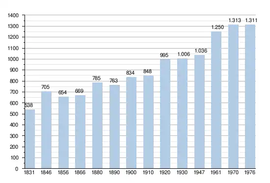 Les chiffres des années 1831 à 1970 tiennent compte des chiffres des anciennes communes fusionnées.