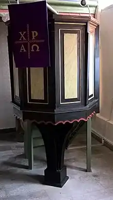 La chaire polygonale simple en bois avec des remplissages très rectangulaires dans les champs de chaire et un pied carré est l'un des meubles d'origine de l'époque de la construction[1]. L'autel rectangulaire est en bois. La peinture noire à veines blanches imite le marbre. Il y a un crucifix à trois clous sur l'autel. Derrière l'autel, il y a un berceau de la même largeur, dont les morceaux de bois prennent la forme de la croix. Le berceau est ouvert à Noël et montre des scènes de la Nativité. Les bancs d'église en bois laissent une allée centrale et, comme les galeries, ont un cadre vert olive.