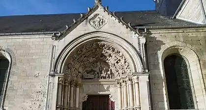 Le porche principal est divisé en deux par une colonne sur laquelle s'appuie la statue de sainte Radegonde portant dans sa main gauche le reliquaire de la Sainte- Croix.
