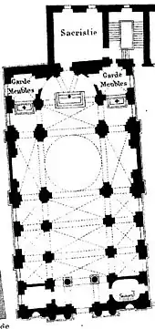 L'église est construite selon un plan en croix latine, orientée à l'ouest[8]