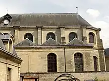 L’architecture extérieure est d’une grande sécheresse, et la décoration sculptée est presque absente. L’organisation des élévations sur deux niveaux est maintenue de tous les côtés. Du côté de la façade, sur les murs latéraux du narthex et sur le chevet en hémicycle, le rez-de-chaussée est séparé de l’étage par un entablement légèrement proéminent. En revanche, l’entablement qui termine l’étage comporte une corniche moulurée fortement saillante, et n’est pas sans évoquer l’entablement qui règne à l’intérieur. Les travées et les baies du chevet sont séparées par des contreforts, qui sont scandés par les entablements présents sur les murs, mais ne possèdent pas de décoration supplémentaire. Au début du premier étage, les contreforts présentent une retraite en quart-de-rond. Il est à noter que le narthex, et donc la façade sur la rue, sont dépourvus de contreforts. Le clocher n’est qu’un mognon, dont les murs atteignent la même hauteur que ceux du vaisseau central, de sorte que le sommet de son toit n’arrive même pas à la hauteur du toit du vaisseau central. Ce clocher purement fonctionnel n’est quasiment pas visible depuis le domaine public. Le vaisseau central est recouvert par un toit à croupe, qui est en hémicycle au-dessus du chevet. Les travées des bas-côtés et la sacristie ne se distinguent pas ; leur entablement est seulement esquissé, ils sont dépourvus de contreforts, et recouverts individuellement par des toits en pavillon[18].