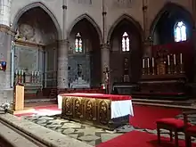 Le nouveau maître autel (utilisé après le concile Vatican II) est en bois sculpté ; sur la façade sont représentés les quatre évangélistes.