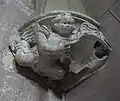 Cette figure mythologique est, aujourd’hui comme à l’époque de la construction, trop éloignée du sol pour être clairement comprise. Elle participe du même répertoire décoratif "grotesque" des années 1540-1550 qui caractérise les sculptures du porche[31].