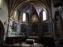 À l’intérieur, dans le chœur de l’église, un placage de boiseries peintes de style classique qui encadre des toiles dédiées à la Vie de la Vierge a été mis en place au début du XVIIIe siècle[26]. La voûte du chœur a d'autre part été entièrement reprise au milieu du XIXe siècle, lors des grands travaux de décoration qui ont donné à la nef et en particulier aux voûtes leur aspect actuel « néo-Renaissance »[20],[24].