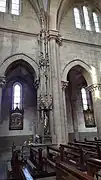 - Les tourelles du jubé : Le jubé a sans doute été élevé peu après l'achèvement du chœur, vers 1300. Il a été détruit partiellement en 1718 : il n'en reste que deux tourelles latérales à cinq pans situées à l'entrée du chœur[19]. D'après un plan établi au XIXe siècle, ces tourelles renfermaient des escaliers en hélice permettant d'accéder à la galerie du jubé[20].
