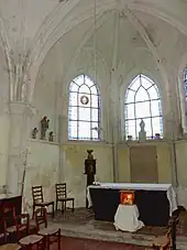 La première travée du chœur conserve sa voûte de la première période gothique. Elle est munie de minces formerets toriques, et ses ogives accusent une fine arête entre deux tores. Dans les quatre angles, les ogives et formerets retombent ensemble sur une colonnette appareillée à chapiteau. À l'intersection avec l'abside, la colonnette forme un faisceau avec une colonnette à chapiteau plus fine, réservée à une ogive de l'abside, et une grêle colonnette sans chapiteau, correspondant à un formeret latéral de l'abside. Assez curieusement, aucun fûts n'est réservé au doubleau séparant les deux travées du chœur. L'on trouve seulement un tailloir à bec (en pointe) et une corbeille de chapiteau coincée entre les corbeilles des deux chapiteaux voisins. Cette composition des supports est atypique, et manque de logique. Elle ne peut s'expliquer que par l'adjonction tardive de l'abside, de sorte que le chœur se terminait pendant quelque temps par un chevet plat après la première travée. Indépendamment de cet aspect, les tailloirs aussi bien que corbeilles ne conservent leur forme d'origine qu'en de rares endroits. Ce n'est que dans l'angle nord-est que le tailloir authentique s'est conservé. Il se compose, du haut vers le bas, d'une plate-bande, d'une baguette, et d'un cavet. La dernière corbeille restée indemne se trouve dans l'angle sud-ouest. Elle est sculptée de feuillages de belle facture. Partout ailleurs, les chapiteaux sont noyés dans le plâtre. Dans l'angle nord-est, deux étoiles et un cœur s'affichent à gauche de la corbeille. Ces motifs sont issus d'une restauration à l'époque moderne. Quelques formes mal définies émergent du plâtre à droite de la corbeille. Les deux fenêtres latérales posent également des problèmes stylistiques. Elles sont en plein cintre, et entourées d'un tore continu qui porte de petits chapiteaux non sculptés, tandis que l'intrados et les piédroits sont moulurés d'un cavet entre deux ressauts. L'arc en plein cintre n'est pratiquement plus utilisé après le début du XIIIe siècle, même si des exceptions existent, comme sur les chevets d'Éméville et Rieux. En même temps, le tore portant des chapiteaux ébauchés évoque la période rayonnante tardive, et la mouluration de l'intrados, la période classique. Par ailleurs, elle est très irrégulière, et semble avoir été réalisée en plâtre. Contrairement à l'usage, le seuil est également mouluré d'un tore. L'abbé Lebeuf dit que les vitrages actuels datent du XVIIe siècle[5]. Ils sont apparemment toujours en place, comme l'indiquent les ferrures et la bordure en verre bleu et jaune. C'est donc lors de la pose de ces vitrages que les fenêtres ont reçu leur forme actuelle.