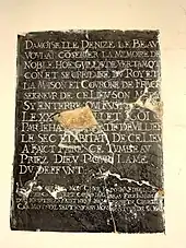 - La plaque commémorative en marbre noir scellée dans le mur méridional de la nef, mesurant 45 cm de haut et 33 cm de large, a été installée en 1601 par damoiselle Denise Le Beau, en mémoire de son mari[9]. Celui-ci, Guillaume de Verthamont, secrétaire du roi, avait racheté la seigneurie de Villaines en 1598[3]. Le 28 juillet 1601, il a été assassiné par Jehan Mignon, natif du village voisin de Villiers-le-Sec[4]. La plaque aurait été brisée par un habitant de ce village[réf. souhaitée]. Elle porte l'inscription suivante : « Damoizelle Denize Le Beau Voulant coserver la mémoire de Noble Homme Guillaume de Vertamont coner et secrétaire du Roy et la Maison et Couronne de France seigneur de ce Lieu Son Mari Sy enterré Qvi Fvst assassiné le xxviiie De Ivillet 1601 par Iehan Mignon Natif de Villier le Sec et abitant De ce Liev A Faict Faire Ce Tombeav Priez Diev Povr Lame Du Deffvnt. Lassassin qvi tva mon Cher Espovx Fidelle Le Perca de sept covps d'vng bras Fier Inhvmain d'vng mevrtre en Feist nevf Meschanceté Crvelle Car moy noz sept enfans Movrons tovs de sa Main »[9].