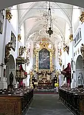 La nef est complétée par deux chapelles latérales et un crucifix dans sa partie ouest. L'autel principal est de style baroque avec une peinture remarquable de Karel Škréta, La Vierge Marie et Saint-Jean-Baptiste participant à la défense de Malte en 1565 [2]. On y trouve toujours les bancs sculptés du début de l'époque baroque.