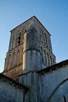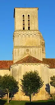 Le clocher rappelle celui de l'église Notre-Dame de Thézac : même tour carrée, mêmes arcades et, surtout, mêmes angles arrondis formant colonnes.